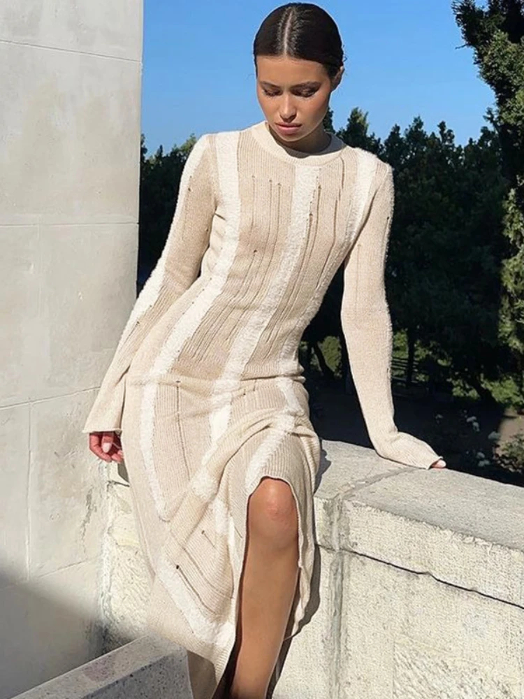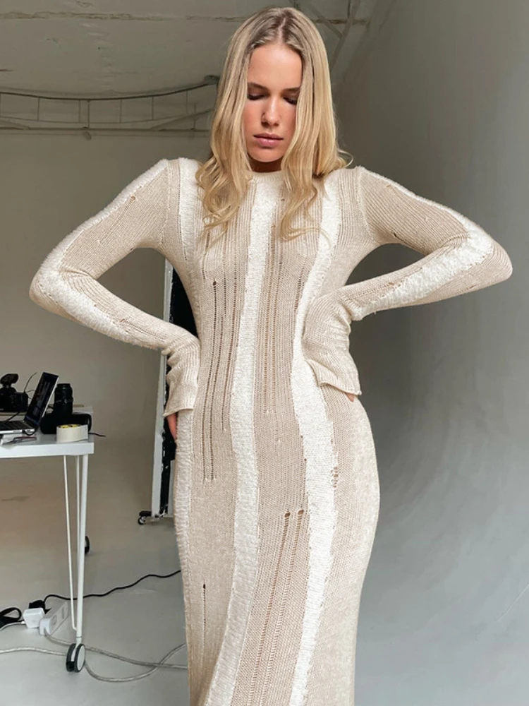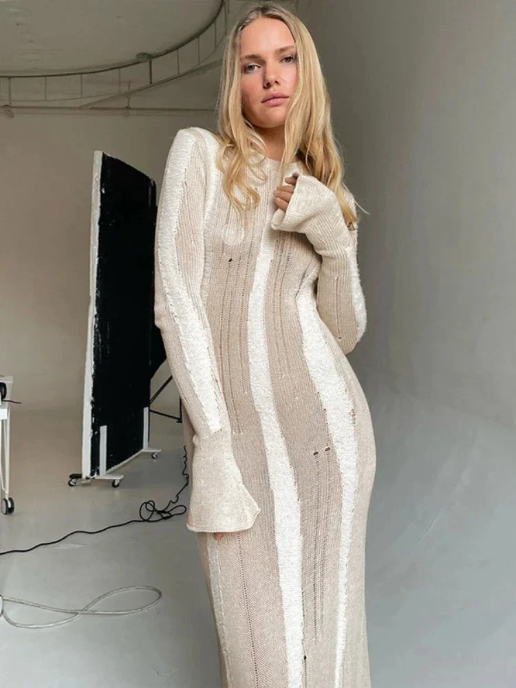 Sa coupe ajustée épouse vos courbes avec finesse tout en vous garantissant un confort absolu. De plus, les manches longues évasées et les rayures verticales en tricot ajoutent une touche de sophistication décontractée à votre look. Ajoutez cette pièce à votre garde-robe et laissez-vous séduire par son charme bohème irrésistible.