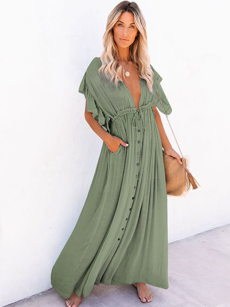 Cette robe bohème légère et élégante est parfaite pour les jours d’été. Elle a une taille haute qui vous permet d’être à l’aise et de flatter votre silhouette. Une finition intemporelle col en V et manches courtes complète le look, vous offrant une touche décontractée mais à la mode. La longue coupe apporte un volume additionnel tandis que le tissu en coton très doux offre une grande respirabilité idéale pour les journées chaudes. Le vert menthe rafraîchissant souligne votre teint et s’accorde à merveille avec divers accessoires tels que des boucles d’oreilles discrètes, des sandales plates colorées ou encore un sac pailleté pour la sortie en soirée. Complimentez ce look avec des boucles d’oreilles, qui seront parfaitement coordonnés avec la couleur douce de la robe bohème longue de plage verte en taille haute.