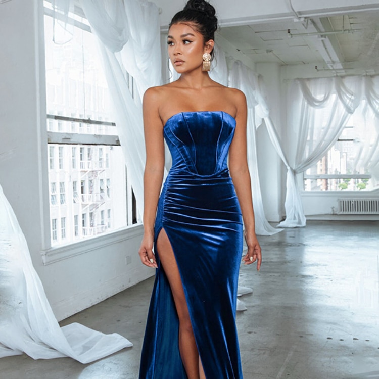 Que vous soyez invitée à un mariage, à une soirée de gala ou à tout autre événement habillé, notre robe bustier en velours bleu avec dos nu sera un choix parfait. Elle peut être associée à des accessoires élégants pour un look complet, ou porter seule pour un style plus simple. Que vous souhaitiez un look audacieux ou une tenue élégante, cette robe répondra à toutes vos attentes.