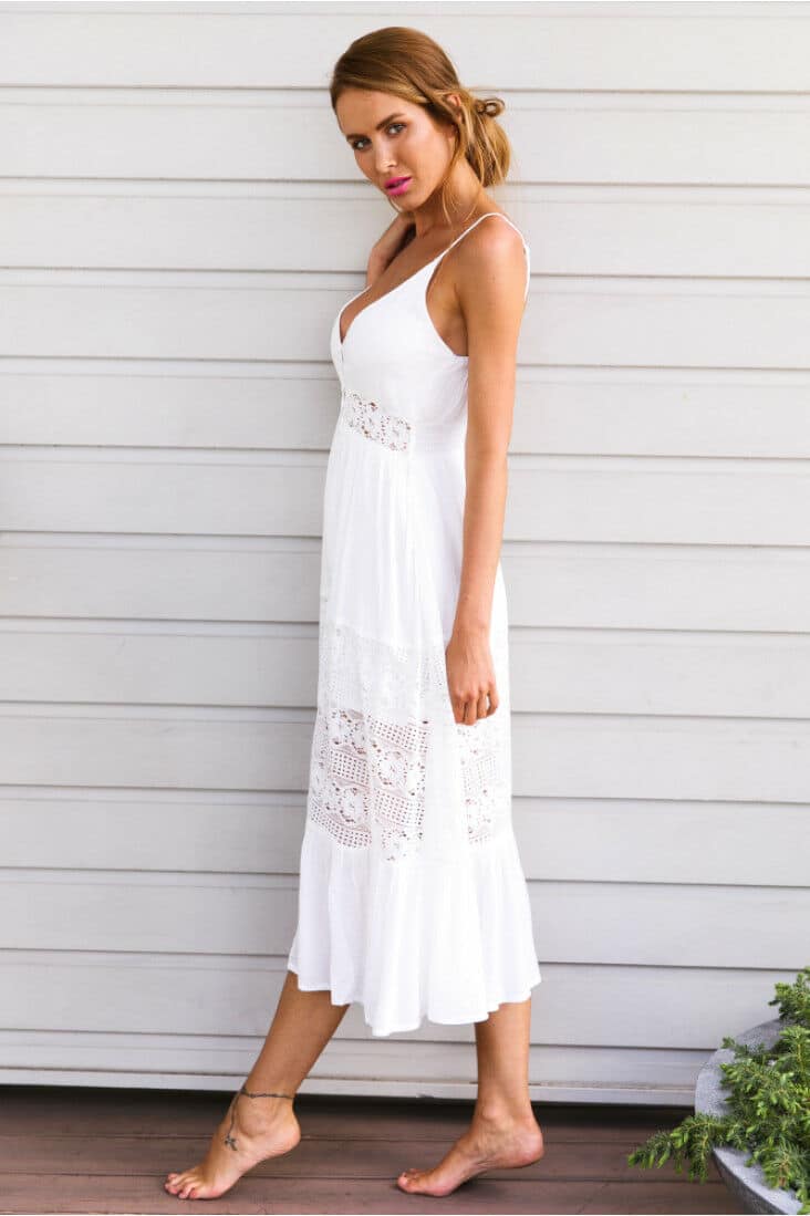 Cette robe de plage blanche en dentelle mi-longue est la pièce essentielle pour votre garde-robe d’été. Elle offre une élégance intemporelle avec sa coupe semi-ajustée et sa taille lâche. Elle est ornée de dentelle fine qui flotte au-dessus du genou pour une touche bohème chic, ainsi que de boutons décoratifs sur le devant, un look féminin et classique. Confectionnée dans un tissu fluide avec une finition douce, cette robe se plie facilement afin de pouvoir être emportée où que vous alliez cet été. Portez-la seule ou sous une veste oversized, le style sera tout aussi impeccable. Depuis le bord de mer jusqu’à votre soirée la plus chic, cette robe mince viendra compléter votre garde-robe basique en simplement quelques coups d’œil glamour du soleil.