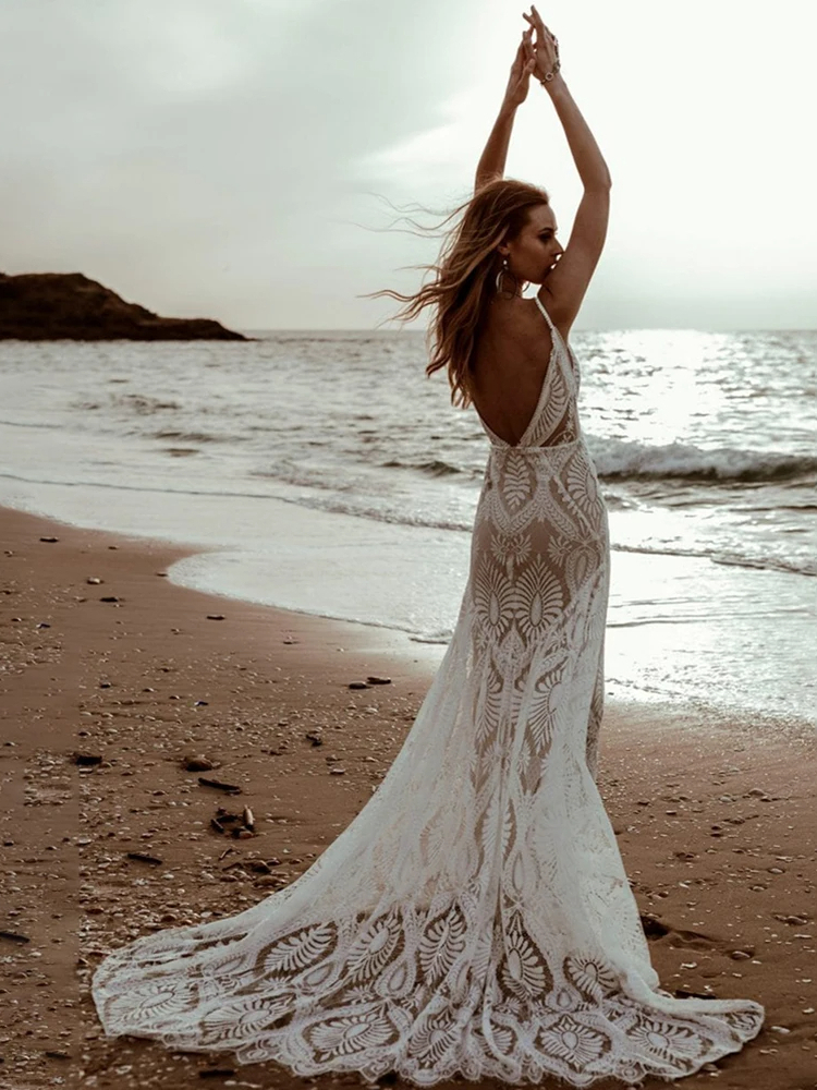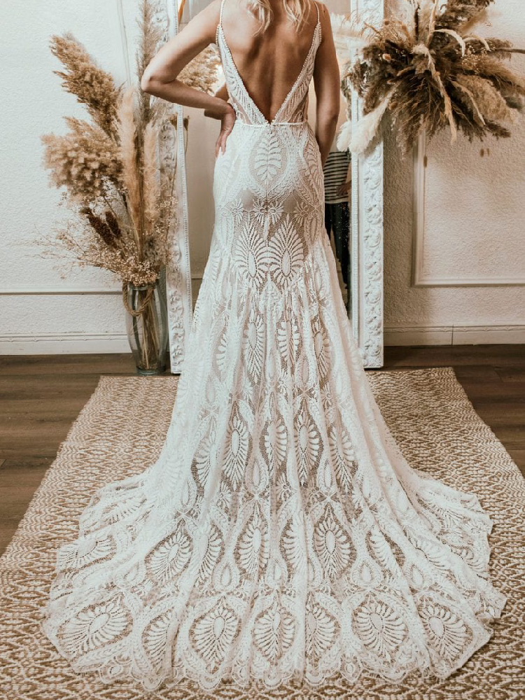 Avec sa dentelle douce et ses jolis motifs, elle est faite pour briller sous le soleil. La doublure couleur chair vous confère cette allure sexy sans trop en faire, tandis que le dos nu est parfait pour marquer les esprits, le jour J ! Laissez-vous charmer par son design unique et commandez-la dès maintenant !