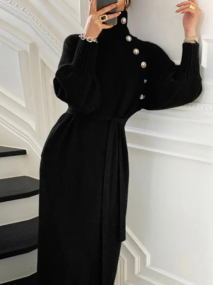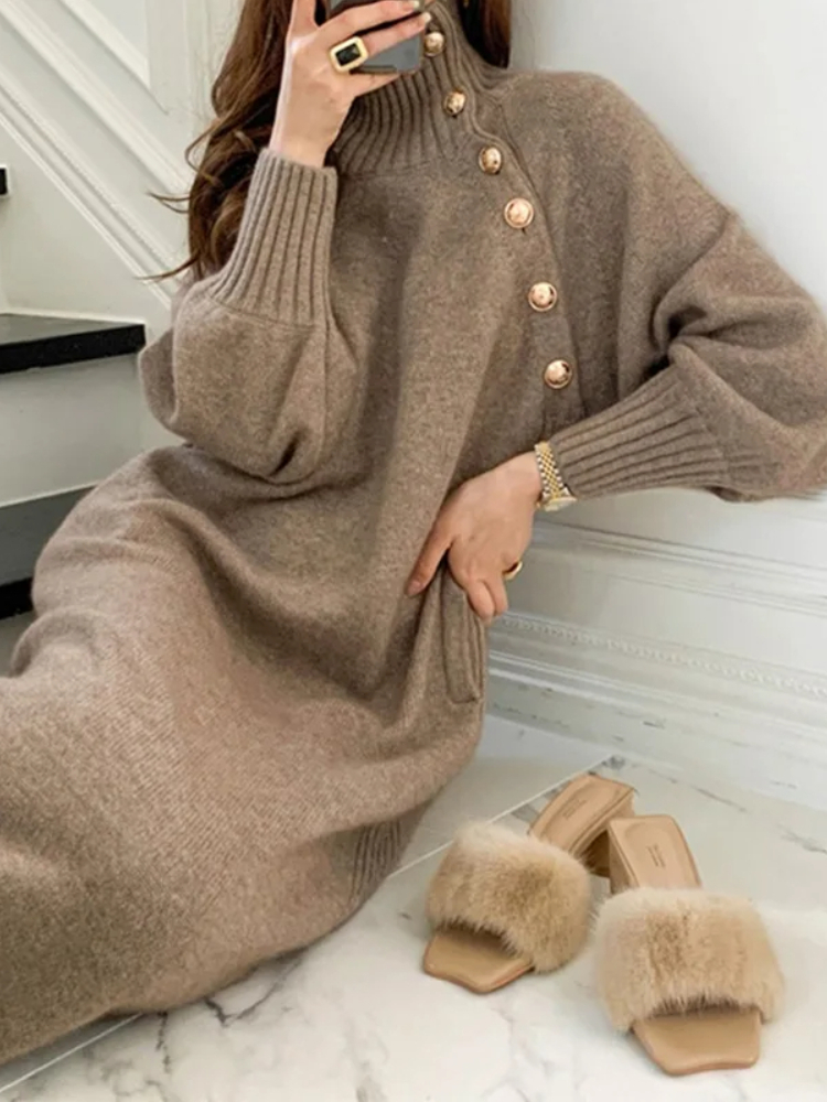 Brillez d’élégance cet hiver avec notre robe d’hiver chic et longue ! Confectionnée pour combiner chaleur et élégance, cette robe est agrémentée de boutons dorés éclatants et d’un col roulé protecteur, qui sublime votre beauté naturelle !