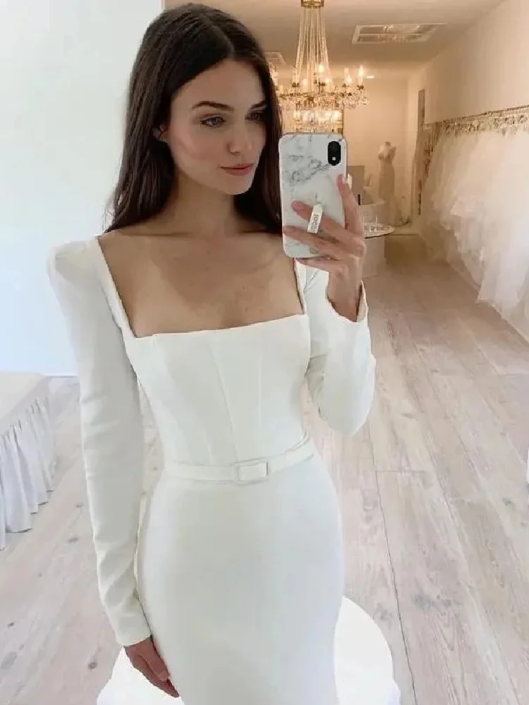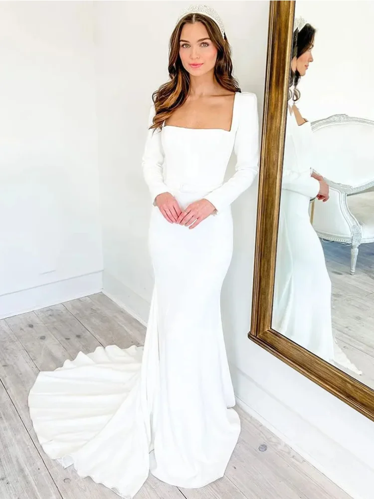 Vous vous mariez cet hiver ? Optez pour notre robe d’hiver pour mariée col carré, une véritable merveille pour votre jour J ! Son col carré et ses manches longues vous offrent une élégance raffinée tandis que sa coupe ajustée et sa traîne somptueuse sublime votre silhouette de la tête aux pieds.