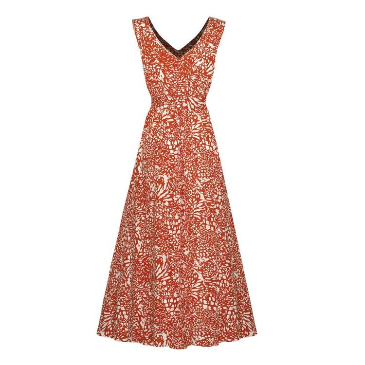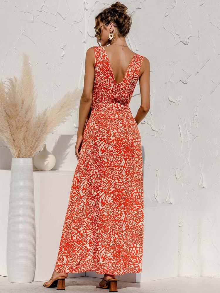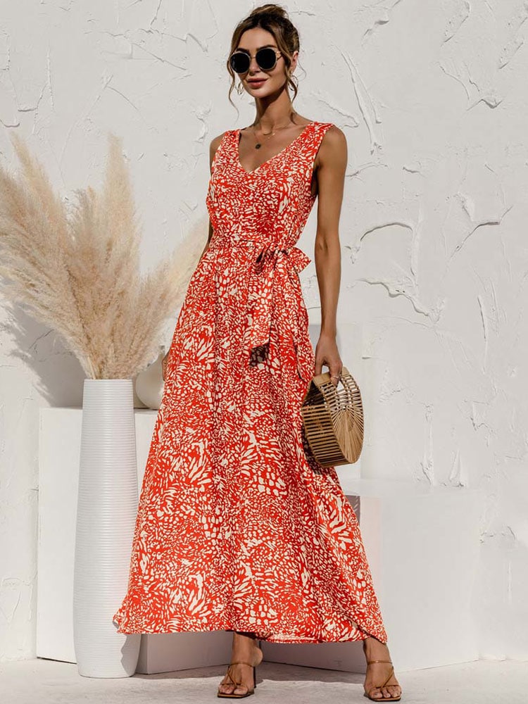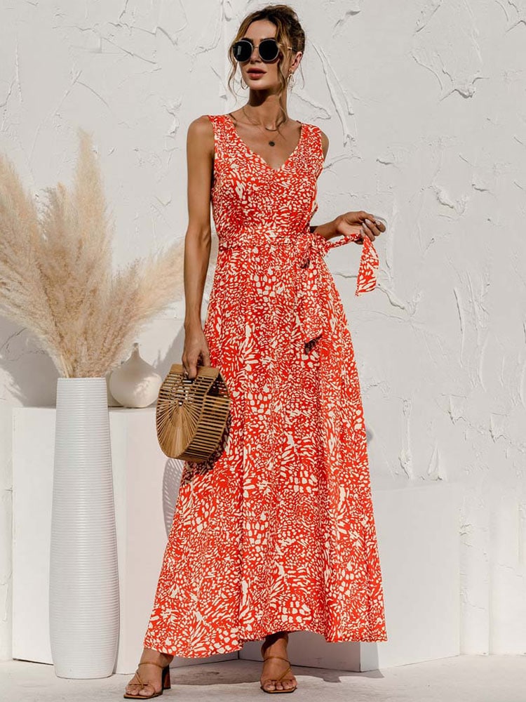 Robe Fluide Longue Orange à Fleurs Nouée à la Taille