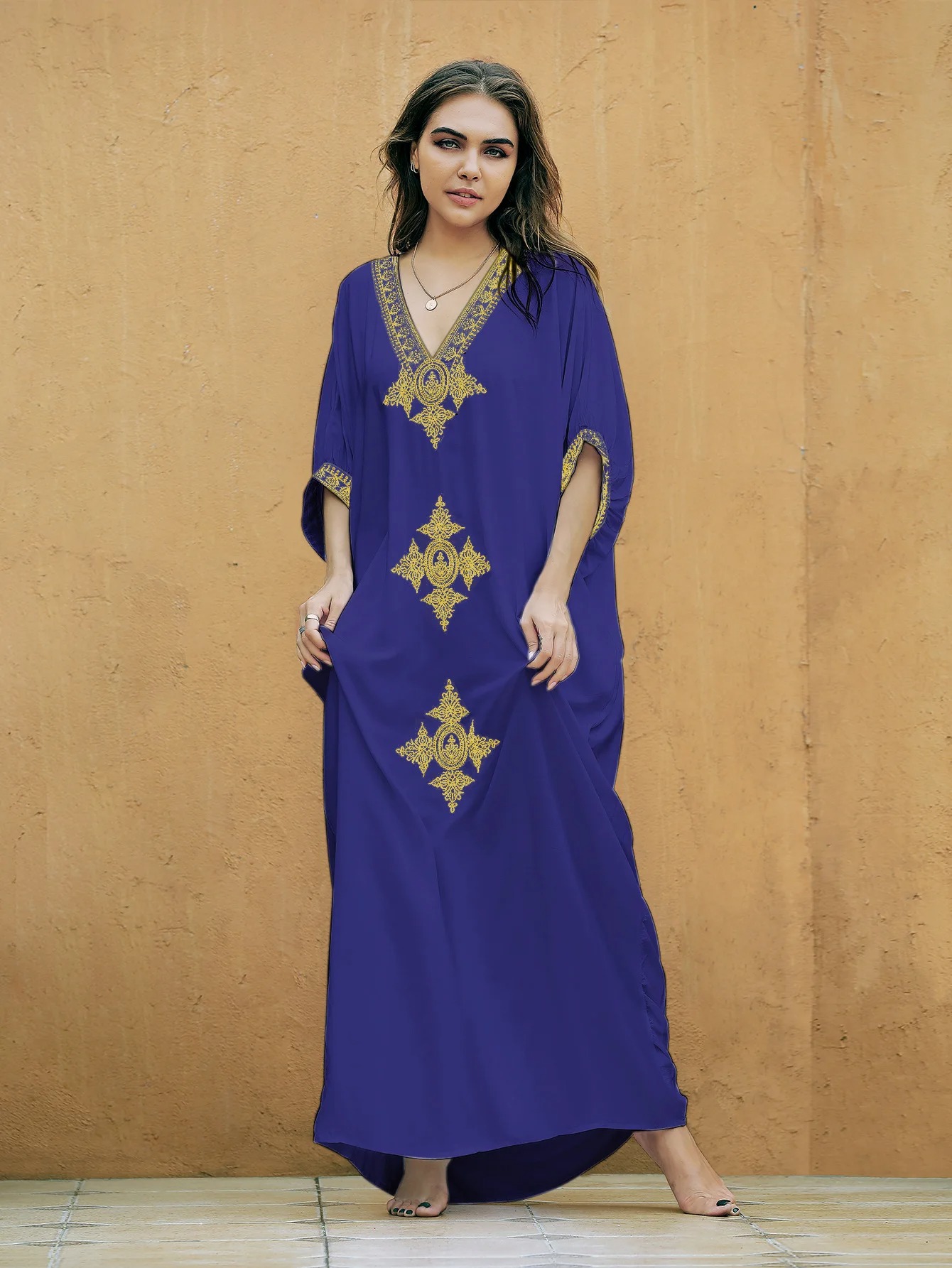 Découvrez notre robe kabyle moderne simple, un bijou de notre collection qui charme instantanément par sa couleur bleu roi intense et ses broderies dorées minutieusement appliquées.