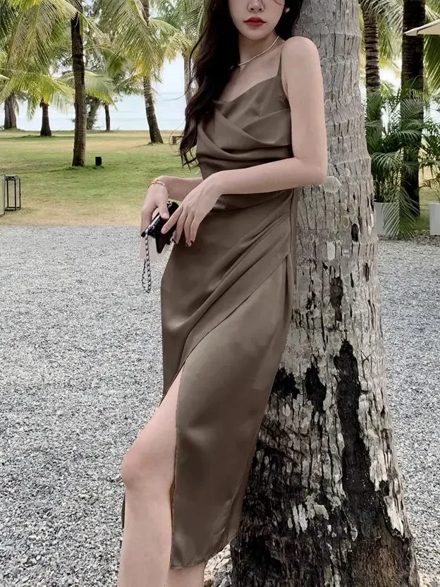 Vous cherchez la tenue parfaite pour votre prochaine occasion spéciale ? Optez pour notre jolie robe kaki en satin ! Chic et simple à la fois, cette pièce est conçue pour valoriser chaque silhouette. De plus, sa coupe fluide et sa fente latérale ajoutent une touche sexy à votre démarche, qui ne laissera personne indifférent !