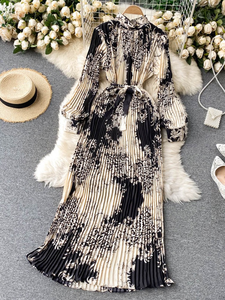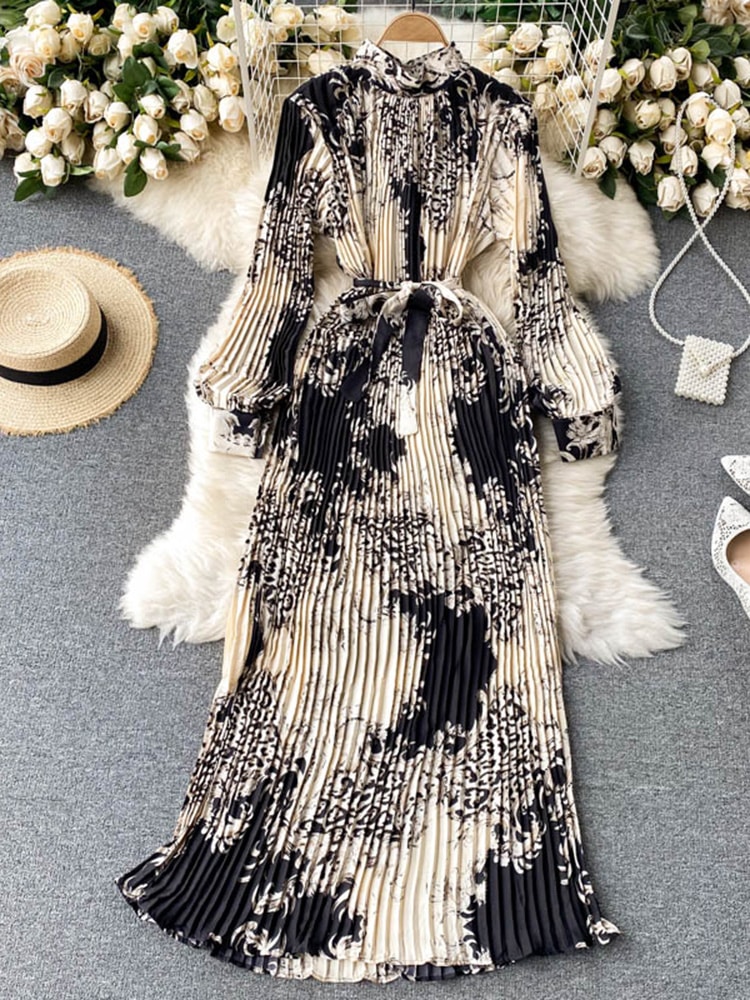 Robe Longue Imprimée Rétro Plissée