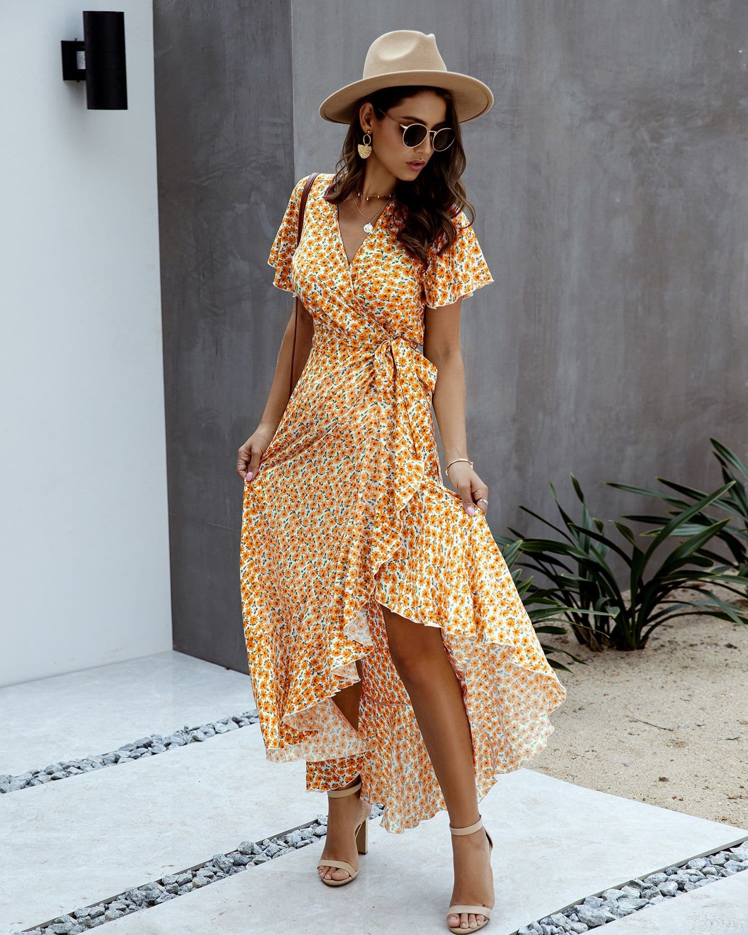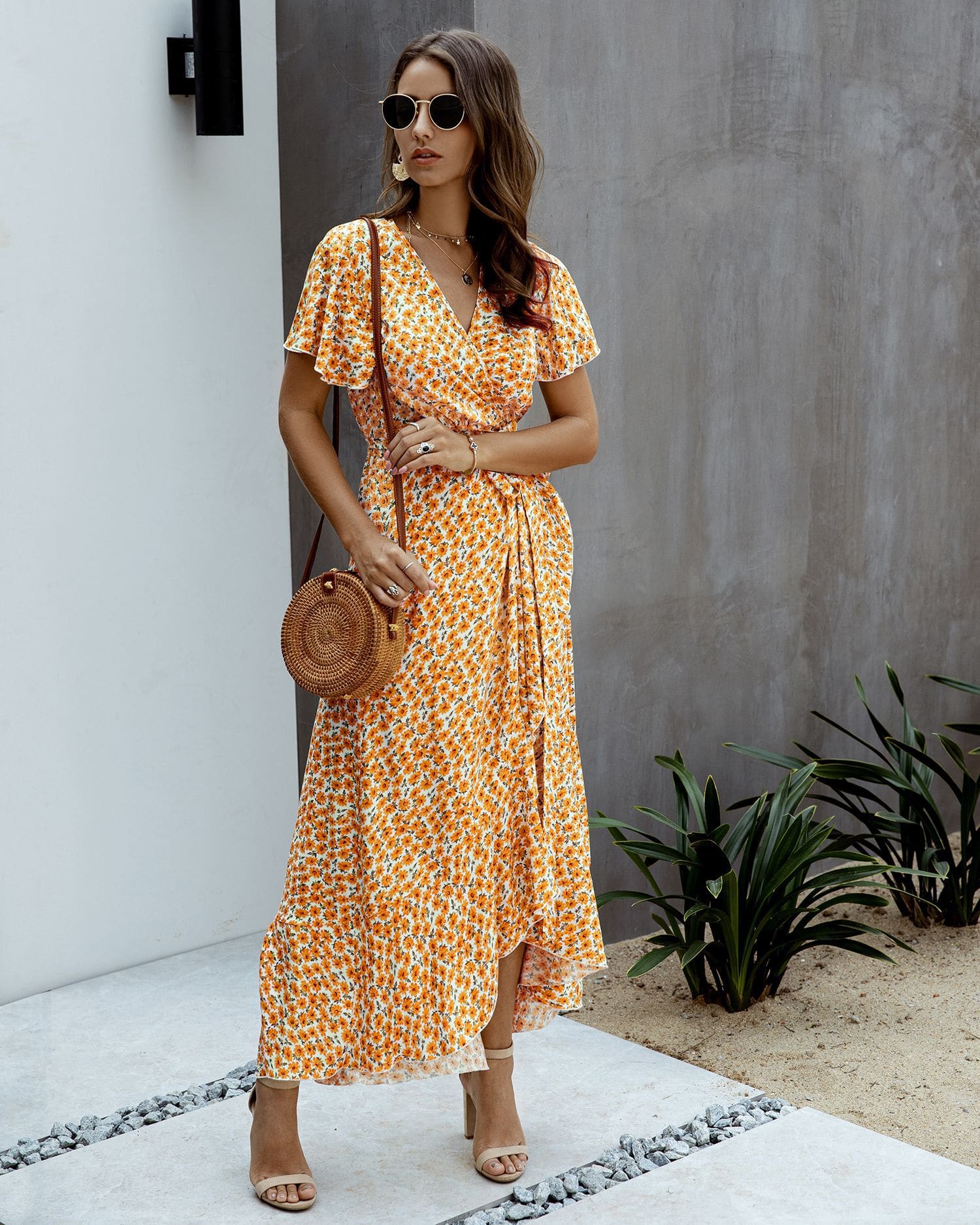 Robe Portefeuille Longue D’été à Motif Floral Orange