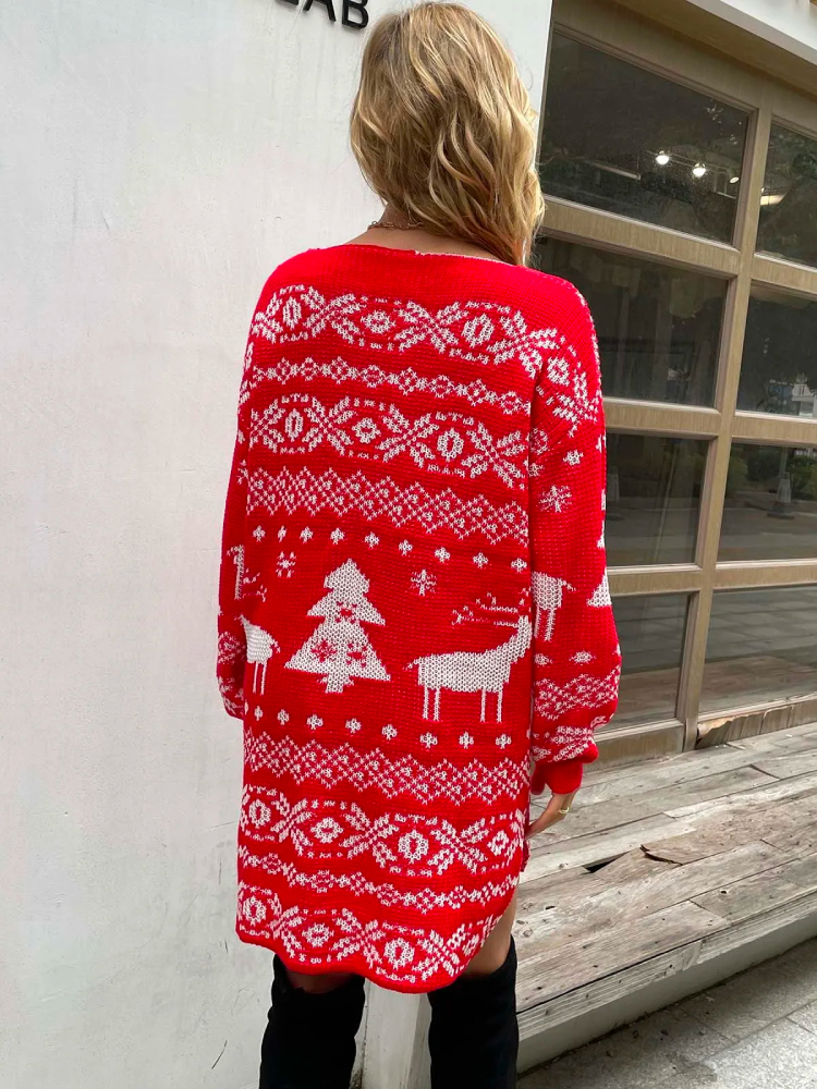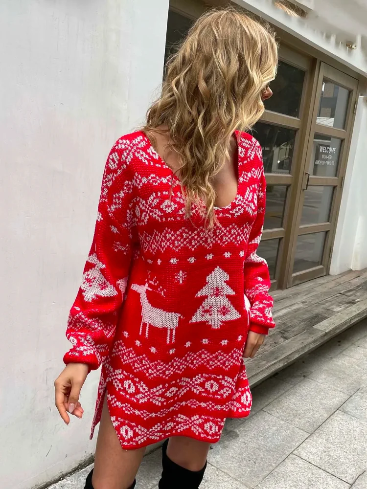 Prête à briller pendant les fêtes ? Notre superbe robe pull de Noël pour femme rouge est faite pour vous ! Avec ses jolis motifs festifs de rennes et de sapins blancs, cette pièce à la coupe oversize et douillette est parfaite pour plonger dans la magie des fêtes.