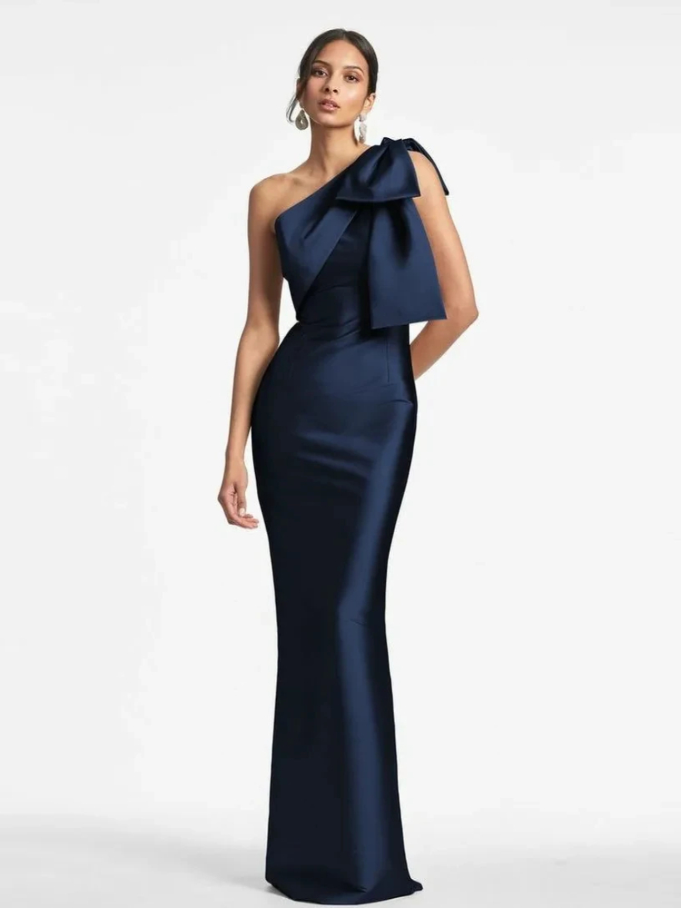 Robe Sirène Bleu Marine à Col Asymétrique