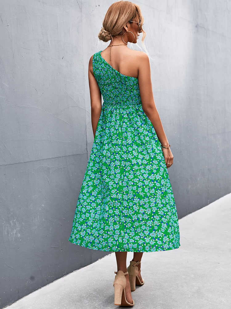 Robe Verte Longue à Fleurs Style Boho Asymétrique pour Femmes